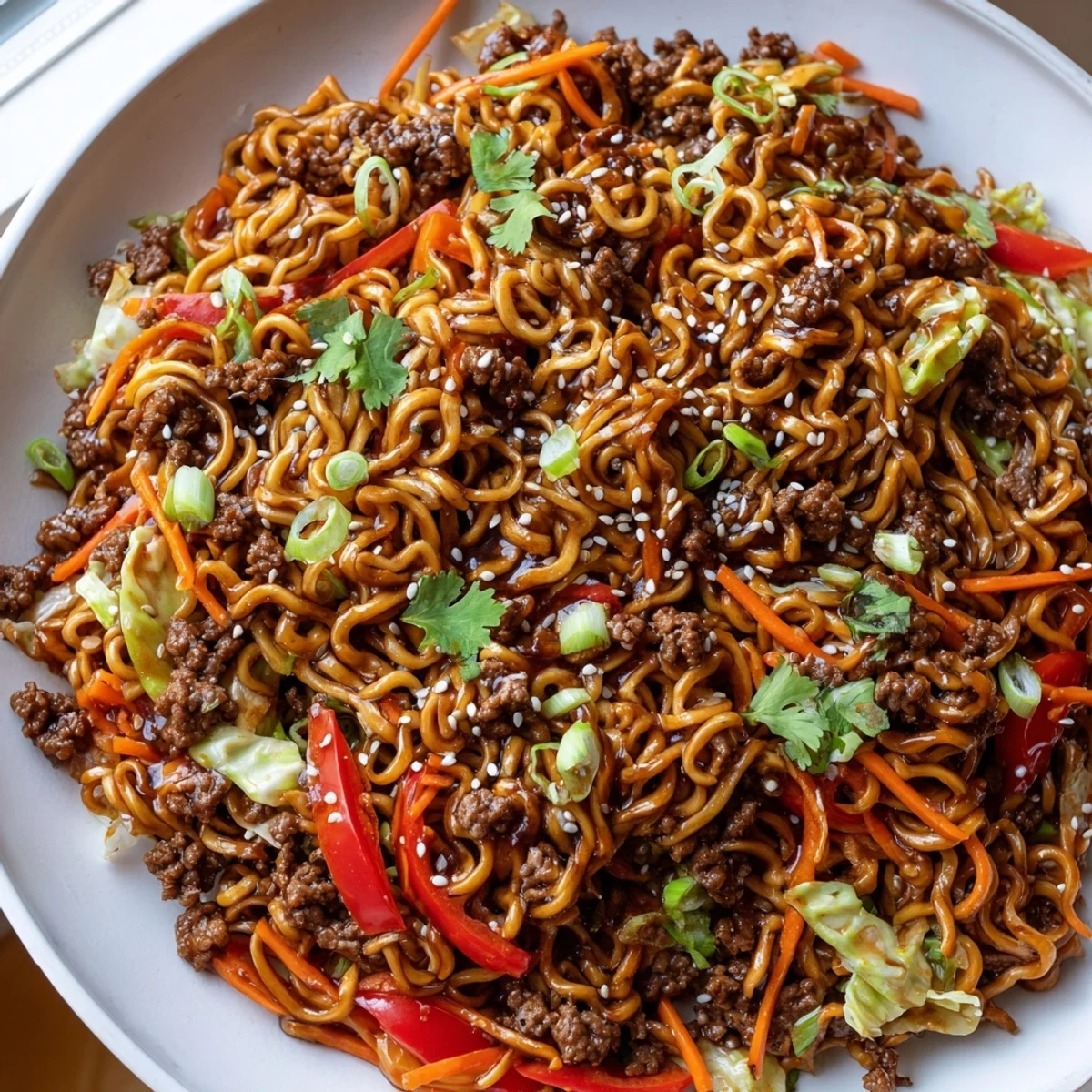 This hearty dish brings together ground beef, crisp vegetables, and egg noodles coated in a rich Asian-inspired sauce. The combination of soy, oyster, and hoisin sauces creates a perfect balance of salty, sweet, and umami flavors that coat every strand of noodles and bite of beef.