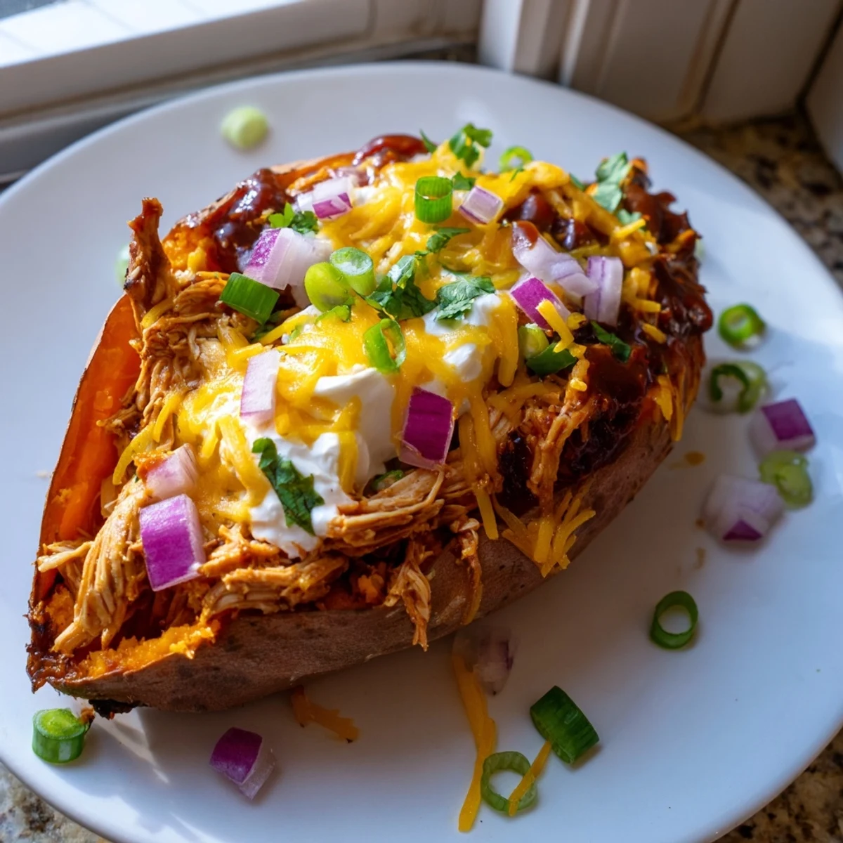 These loaded sweet potatoes combine tender roasted spuds with smoky BBQ chicken and melted cheddar for a hearty, satisfying meal. The contrast between the creamy potato flesh, tangy saucy chicken, and crisp fresh toppings creates perfect balance in every bite.