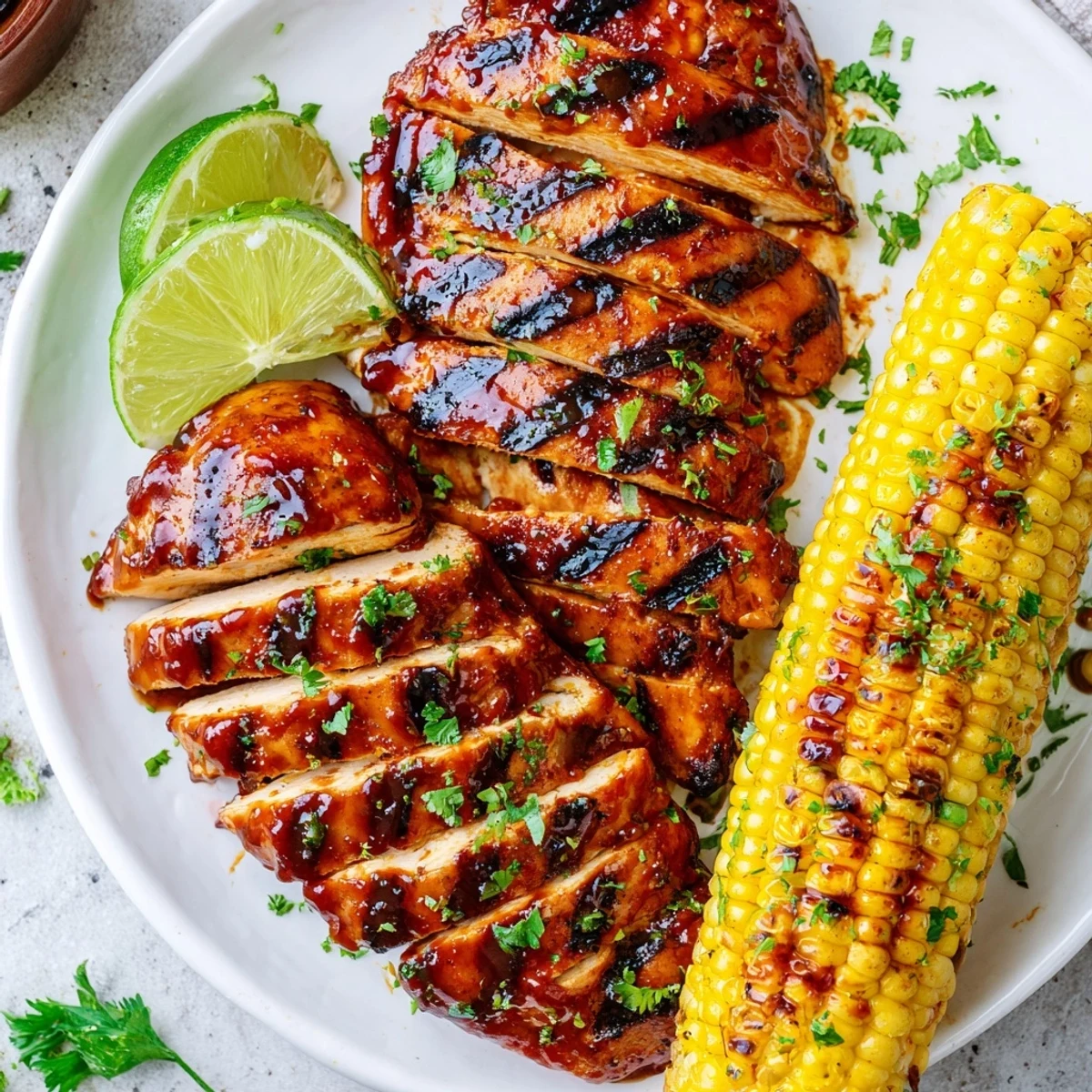 Preheat a medium-high grill and rub boneless chicken breasts with olive oil, smoked paprika, garlic and onion powders, salt and pepper. Grill chicken 6–7 minutes per side, brushing with barbecue sauce in the final minutes, until an internal temperature of 74°C/165°F. Meanwhile brush husked corn with melted butter and turn until charred, about 10–12 minutes. Let chicken rest 5 minutes, slice, garnish with parsley and lime, and serve with potato salad or coleslaw.
