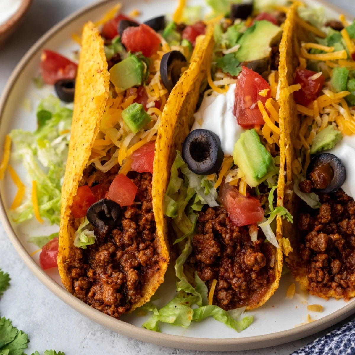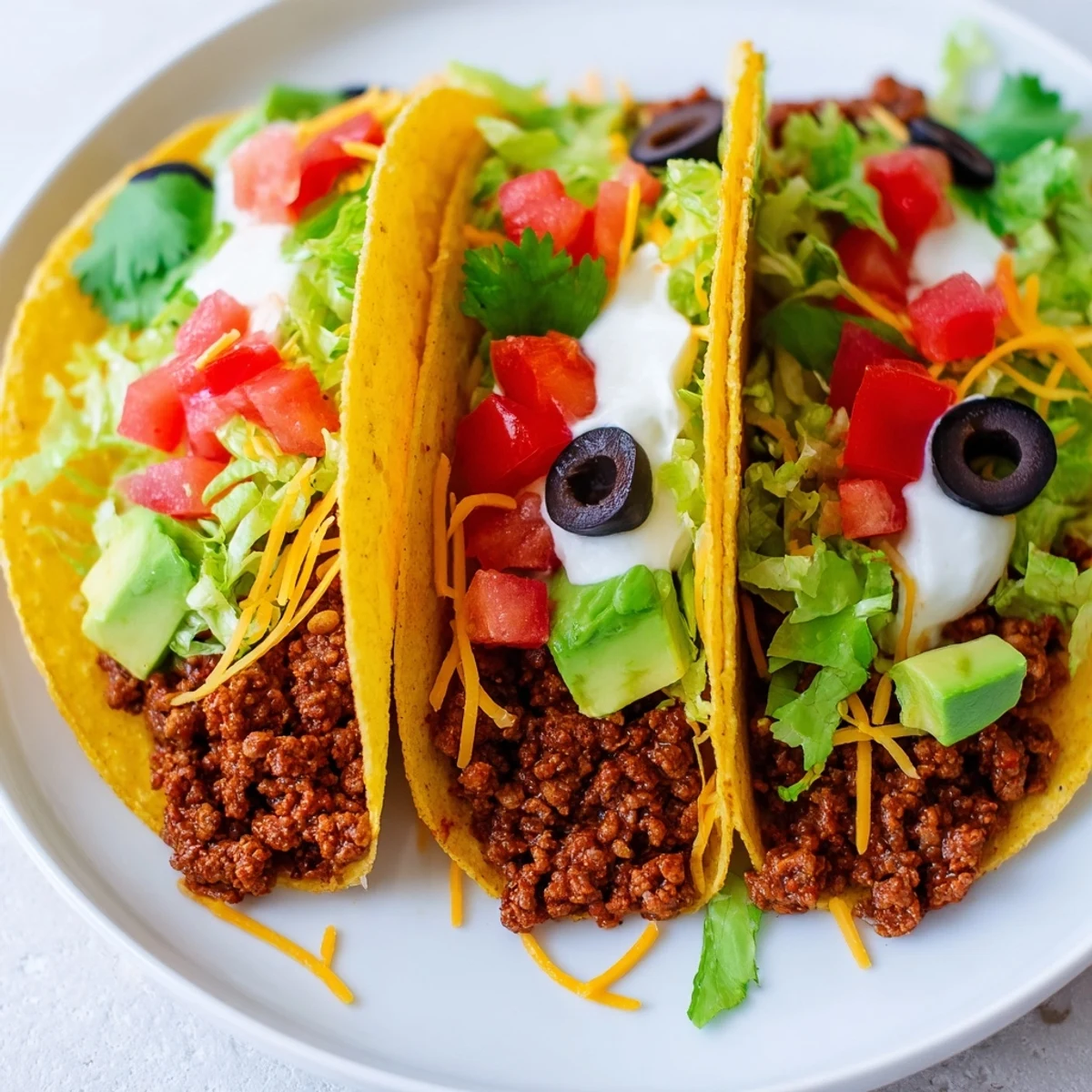 This dish offers seasoned ground beef cooked with onion, garlic, and a blend of spices, simmered to a flavorful finish. Crispy hard shells are warmed and filled with the rich beef mixture, then topped with shredded lettuce, cheese, tomatoes, sour cream, olives, cilantro, avocado, and salsa. Ideal for a quick and festive family meal, it brings together a variety of textures and tastes, easily customizable with alternative proteins or added heat.