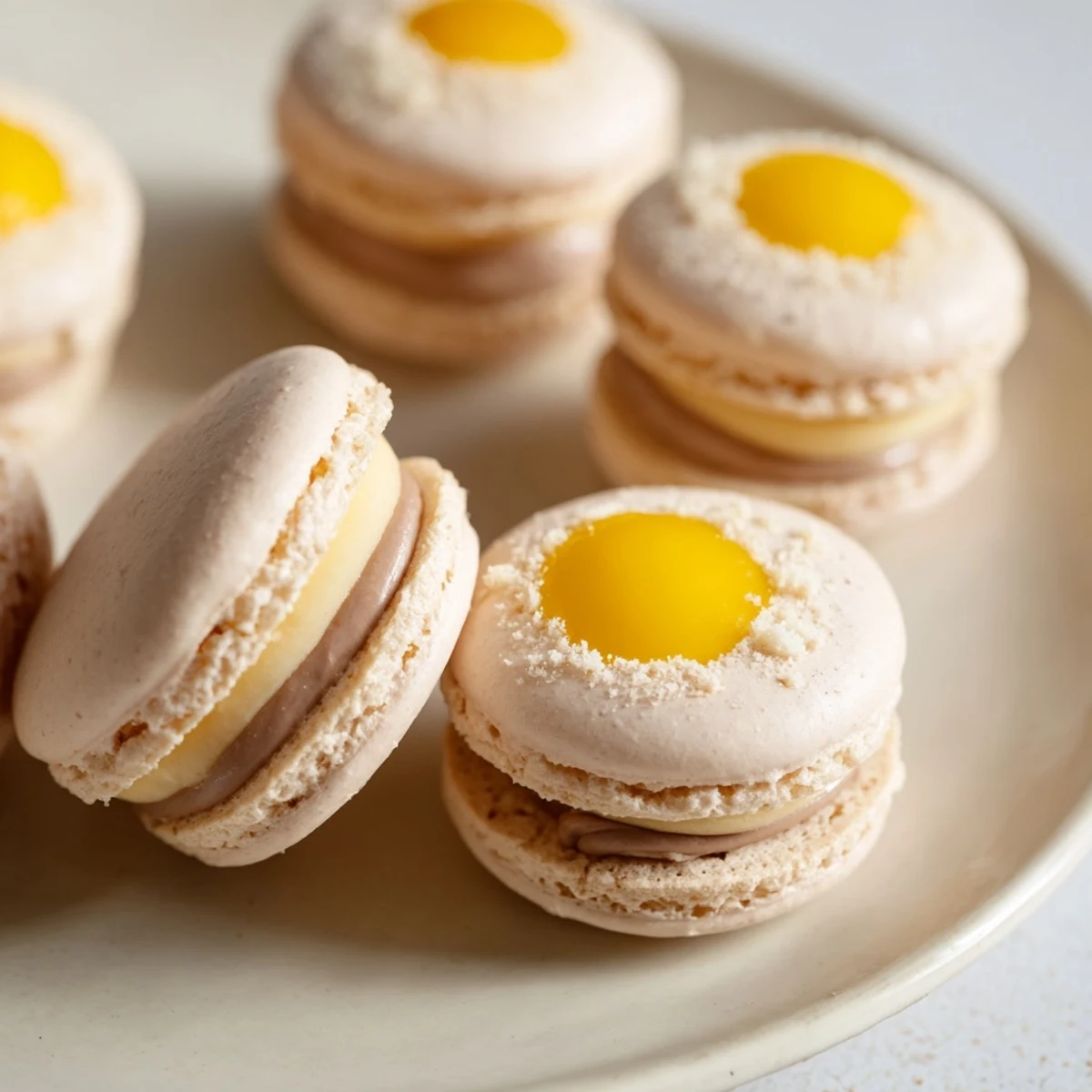 The yellow center trick is easier than it looks and creates such a wow moment when people bite into them. I use a separate small piping bag for the yellow ganache and pipe just a tiny amount in the center of each chocolate ring. Practice on a plate first until you get the ratio right. The key is piping the chocolate ring in a circle rather than spreading it, leaving space for the yolk.