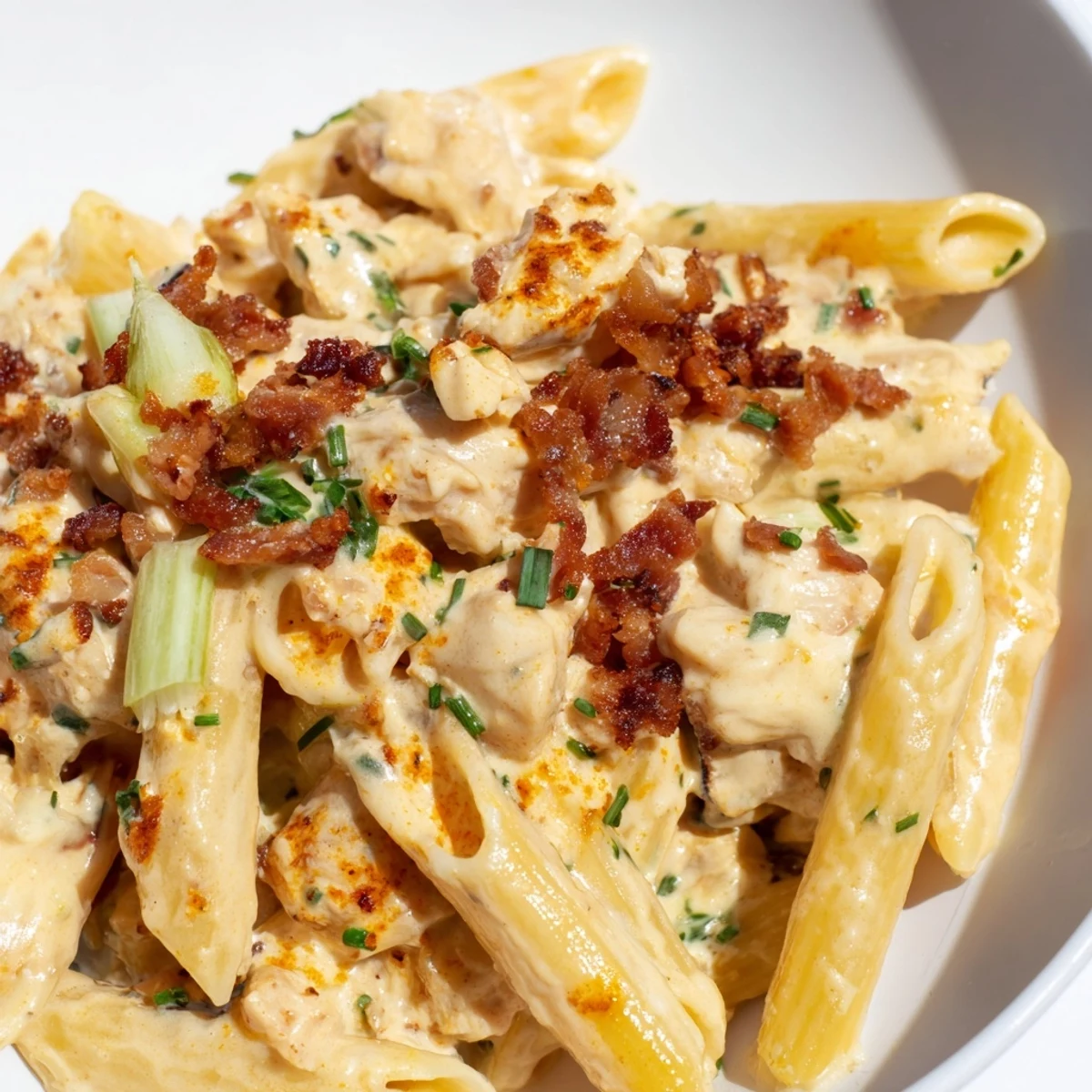 This indulgent pasta dish brings together tender seasoned chicken and al dente penne coated in a luxurious sauce made from softened cream cheese, heavy cream, and sharp cheddar. The crispy beef bacon adds a savory crunch throughout, while fresh parsley, chives, and spring onions brighten each bite with their aromatic flavors.