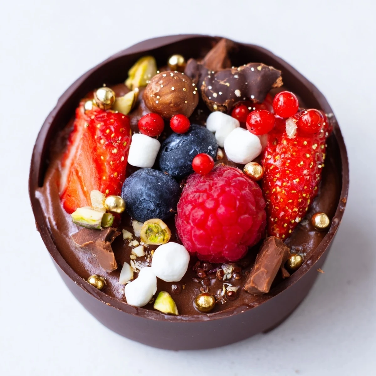 These elegant chocolate grazing cups feature handmade dark chocolate cups filled with silky chocolate mousse, topped with fresh mixed berries, chopped nuts, mini marshmallows, and chocolate curls. The combination of velvety smooth mousse and crisp chocolate shell creates a luxurious texture contrast, while the colorful toppings add visual appeal and varied crunch.