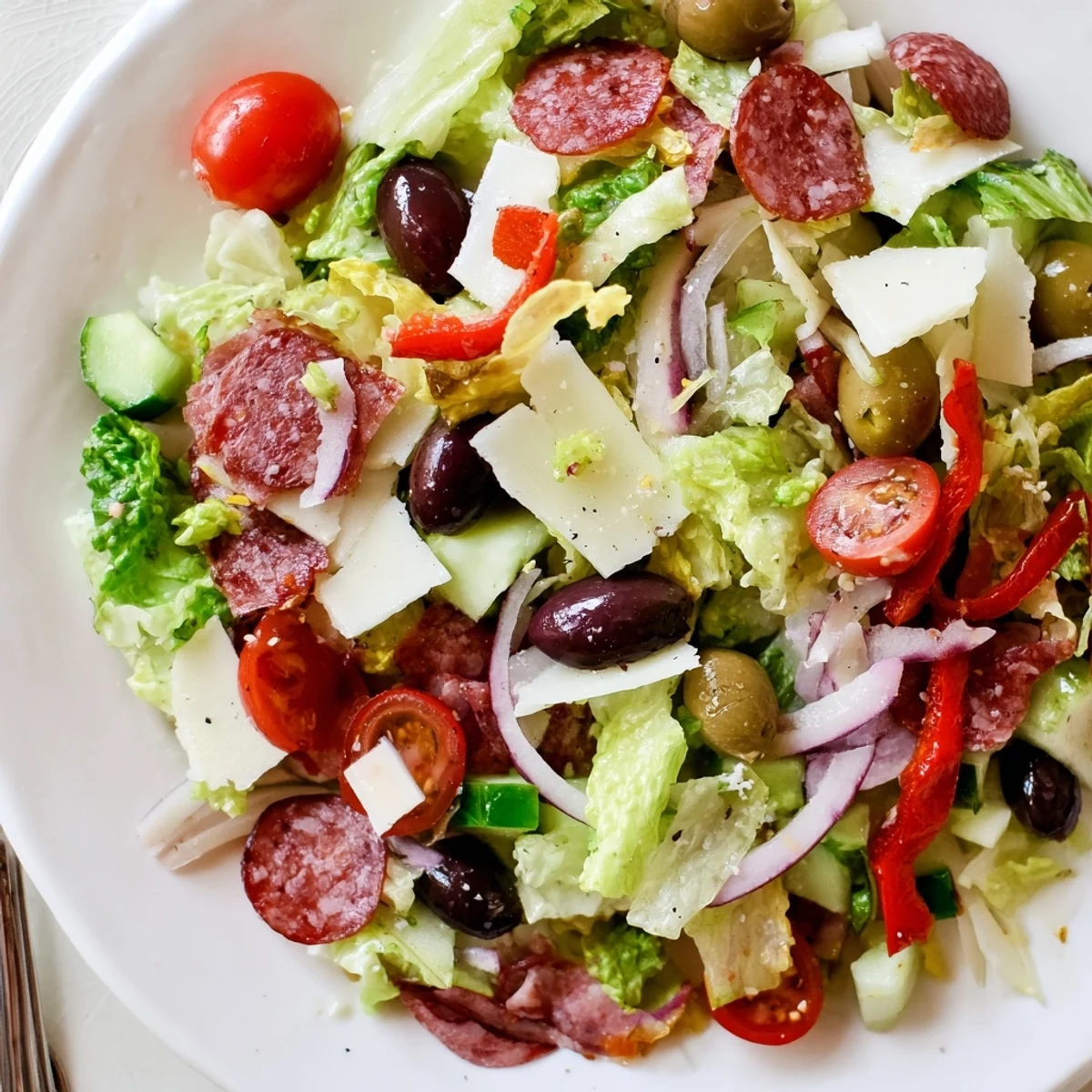 This colorful Italian-style salad combines crisp Romaine lettuce, cherry tomatoes, cucumber, and roasted red peppers with savory Genoa salami, tangy Kalamata olives, and creamy mozzarella. The star is the homemade dressing featuring extra-virgin olive oil, red wine vinegar, garlic, and Italian herbs. Ready in just 20 minutes with no cooking required, this versatile dish works perfectly as a starter or light main course.