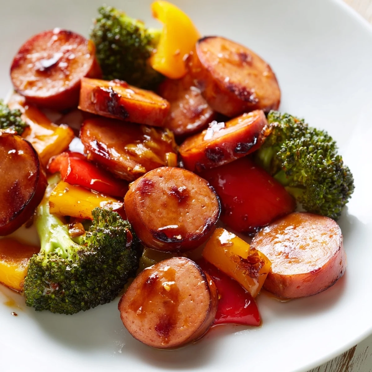 This vibrant sheet pan dinner brings together smoky kielbasa sausage with colorful roasted vegetables coated in a rich honey garlic sauce. The sweet and savory glaze caramelizes beautifully in the oven, creating tender-crisp broccoli, bell peppers, and carrots with perfectly browned sausage rounds. Everything cooks on one pan in just 25 minutes, making weeknight meals effortless and cleanup a breeze. The dish is naturally gluten-free when using appropriate kielbasa and serves four hungry eaters. Perfect with rice, crusty bread, or enjoyed on its own for a complete meal.