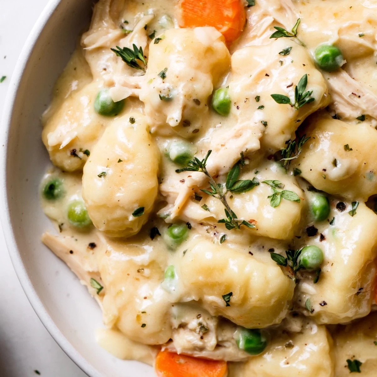 - Add uncooked gnocchi, chicken, and peas, stirring gently to combine and ensuring gnocchi are submerged in the sauce.