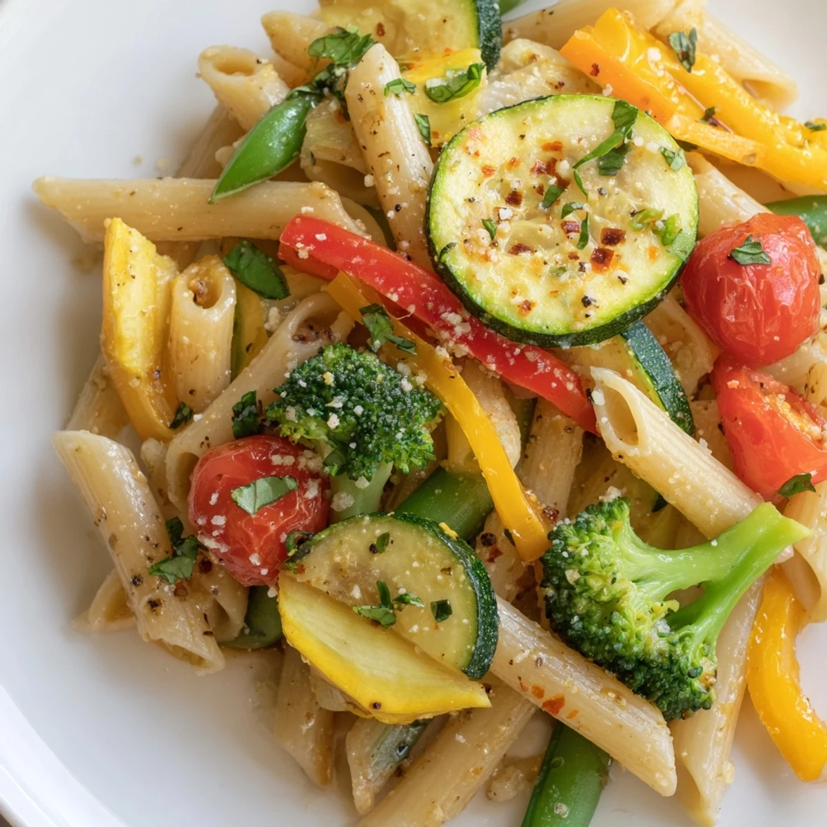 This classic Italian dish combines perfectly cooked penne or spaghetti with an array of vibrant spring vegetables including zucchini, yellow squash, bell peppers, cherry tomatoes, snap peas, and broccoli. The vegetables are sautéed to tender-crisp perfection in aromatic olive oil with garlic, then brought together with a bright lemon-vegetable broth sauce. Finished with grated Parmesan, fresh basil, and parsley, this colorful bowl delivers restaurant-quality results in under an hour. The dish balances tender pasta texture with fresh vegetable crunch, while the light sauce enhances natural flavors without overwhelming.