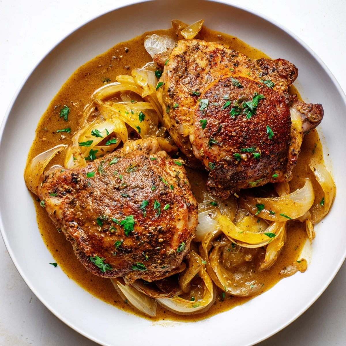 Season bone-in, skin-on thighs and sear skin-side down until deeply browned. Remove, then soften thinly sliced onions in the same pan, add garlic and a dusting of flour, then whisk in chicken broth to form a glossy gravy. Return thighs, spoon gravy over, cover and simmer 25–30 minutes until cooked through. Finish with fresh parsley and serve with mashed potatoes, rice, or buttered noodles.