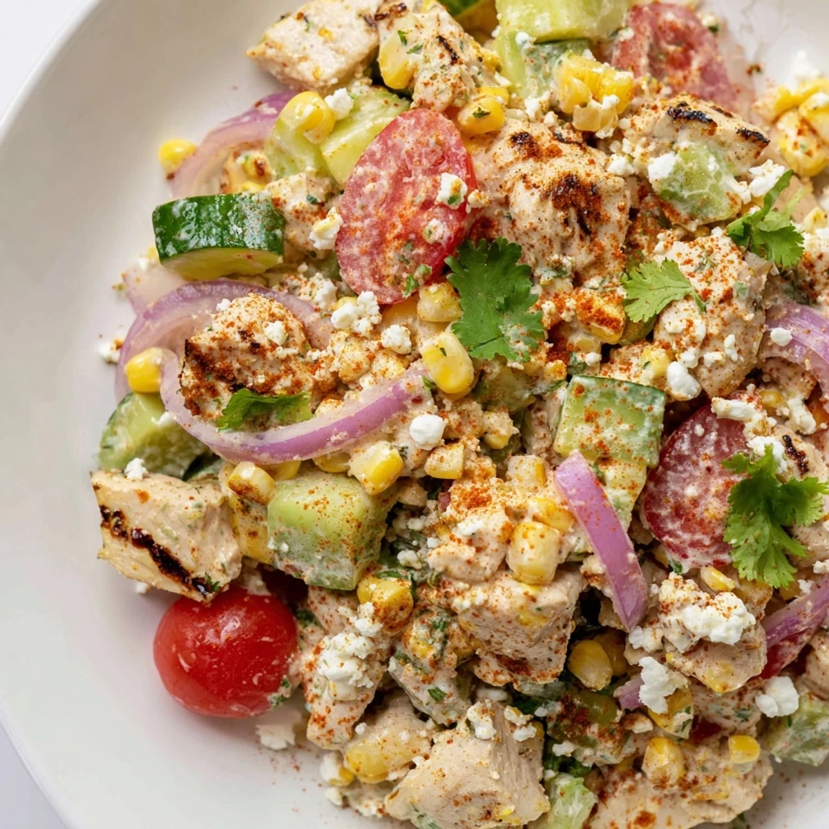 This vibrant salad brings together the best of summer flavors with juicy grilled chicken, cool crisp cucumbers, and naturally sweet corn kissed by the grill. The creamy dressing gets its zing from fresh lime juice and a subtle kick of chili powder and smoked paprika.