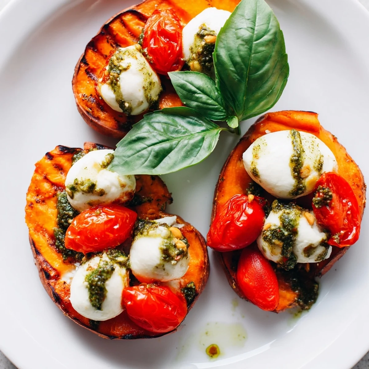 These vibrant sweet potatoes are roasted until tender and caramelized, then topped with juicy cherry tomatoes and creamy mozzarella. A fresh basil pesto drizzled over the top brings everything together with bright, herbaceous flavor. Perfect as a light main or colorful side for summer gatherings.